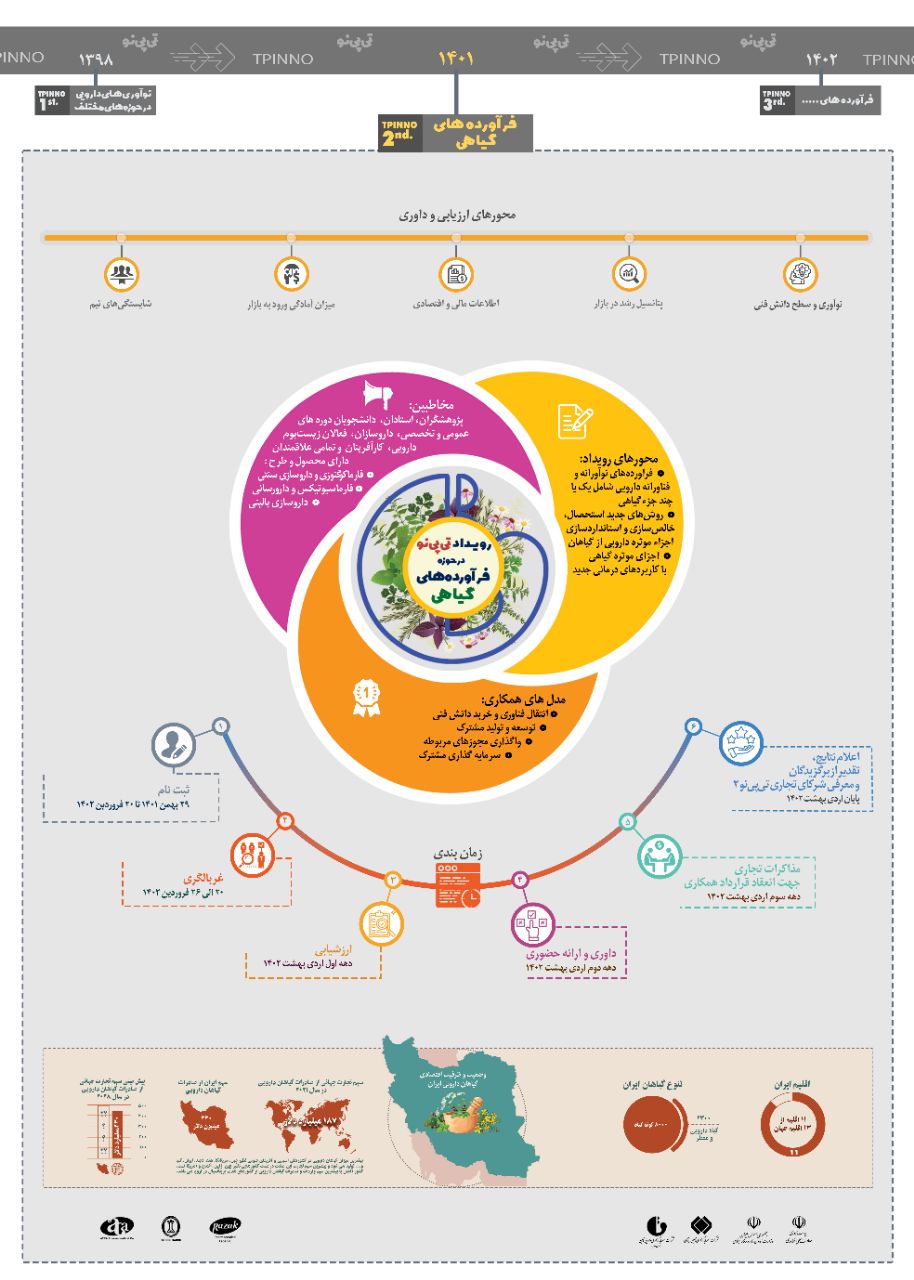 تیپینو توسط شرکت سرمایه گذاری دارویی تامین (تیپیکو) و به منظور تسهیل و تسریع تجاری سازی طرحهای نوآورانه دارویی هدفگذاری شد. ثبتنام جهت شرکت در دومین دوره این رویداد از 29 بهمنماه 1401آغاز شده، و تا پایان فروردینماه سالجاری ادامه دارد. کلیه متخصصان، محققان، کارآفرینان و علاقه مندان به حوزه فرآوردههای گیاهی میتوانند با مراجعه به آدرس tpinno.ir نسبت به ثبت طرح ها و محصولات فناورانه و نوآورانه دارویی اقدام نمایند.