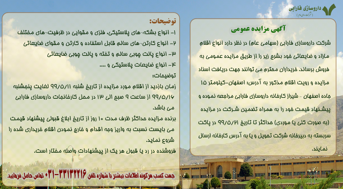شركت داروسازي فارابي (سهامي عام) در نظر دارد انواع اقلام مازاد و ضايعاتي خود بشرح زير را از طريق مزايده عمومي به فروش برساند. خريداران محترم ميتوانند جهت دريافت اسناد مزايده و رويت اقلام مذكور به آدرس: اصفهان-كيلومتر 15 جاده اصفهان – شيراز كارخانه داروسازي فارابي مراجعه نموده و پيشنهاد قيمت خود را به همراه تضمين شركت در مزايده (به صورت كلي يا موردي) حداكثر تا تاريخ 21/5/99 در پاكت سربسته به دبيرخانه شركت تحويل و يا به آدرس كارخانه ارسال نمايند.